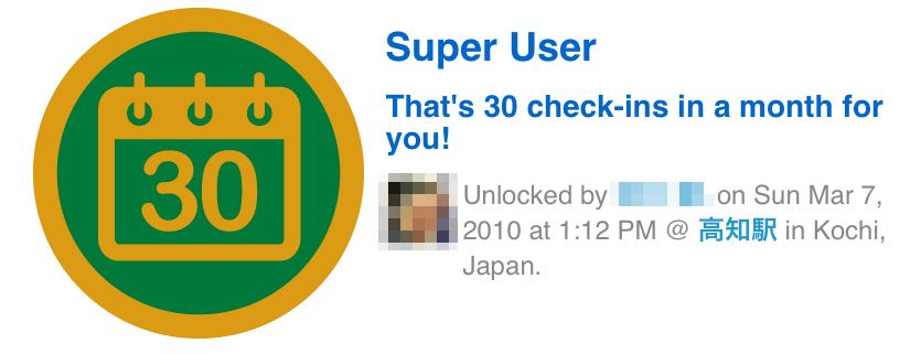 上の2つの画像は同じ人のバッジ情報なのですが、上のSuper Mayorはvenueの情報なし。下はちゃんと「高知駅」と出ています。この表示される条件がまだ不明。チェックインが公開か非公開かも関係ないみたいです。